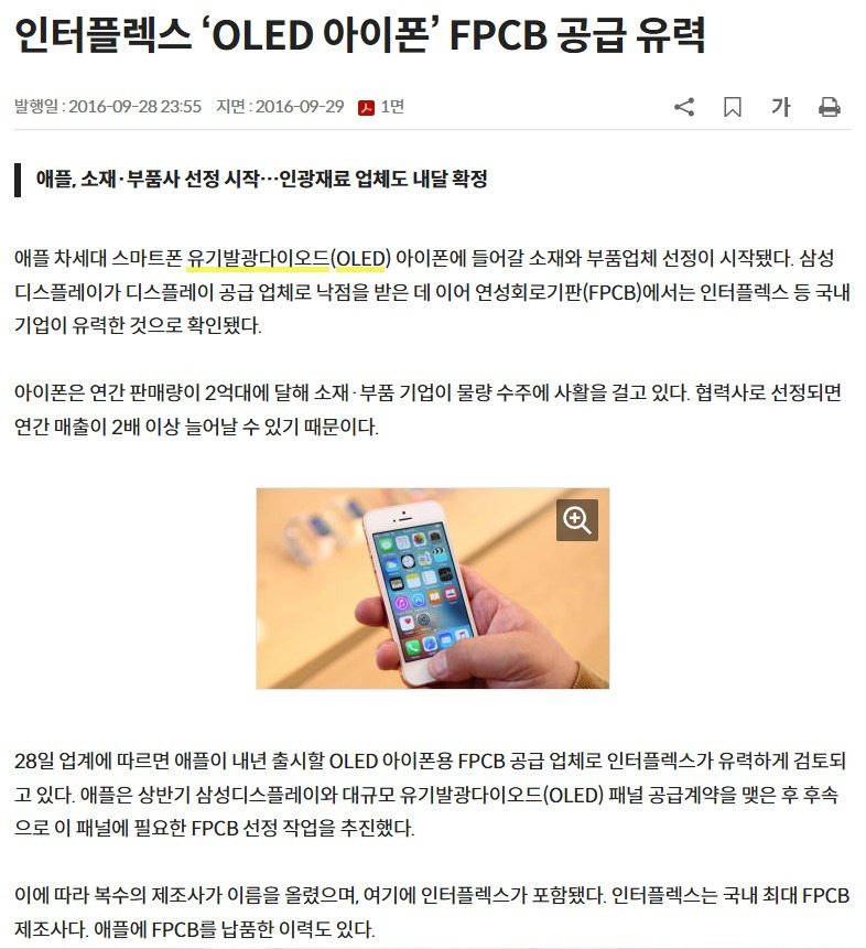 최근에 2017년 애플 아이폰 OLED 채택 당시 비슷한 패턴으로 수혜를 입었던 RFPCB 업체들의 그때 당시 뉴스 플로우를 분석해 본 결과 언론을 통해 공식적으로 공급망에 포함되었다고 확정 기사가 나온 것은 2016년 11월 말이였습니다.