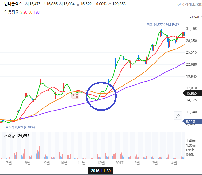 2016년 11월 하반기부터 2017년 초까지 인터플렉스와 비에이치의 주가를 살펴보면 2016 년 11월 30일 확정기사가 나온 이후부터 대세 상승으로 추세를 전환했다는 사실을 알 수 있습니다.